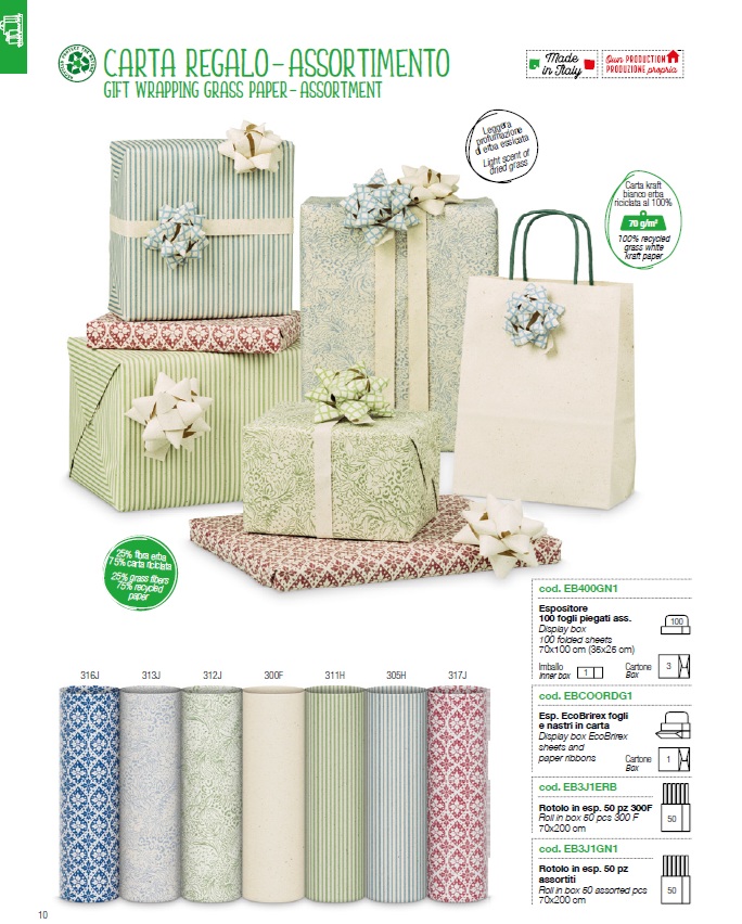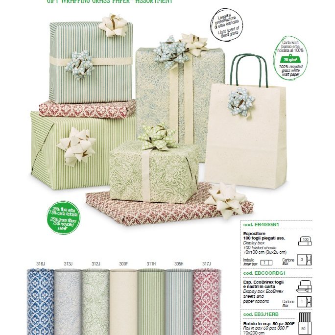 En esta nueva edición, la excelencia en diseño y la sensibilidad medioambiental se encuentran en las gamas ECOCARTA y CARTA ERBA, auténticas expresiones del savoir-faire italiano aplicado al papel de regalo.