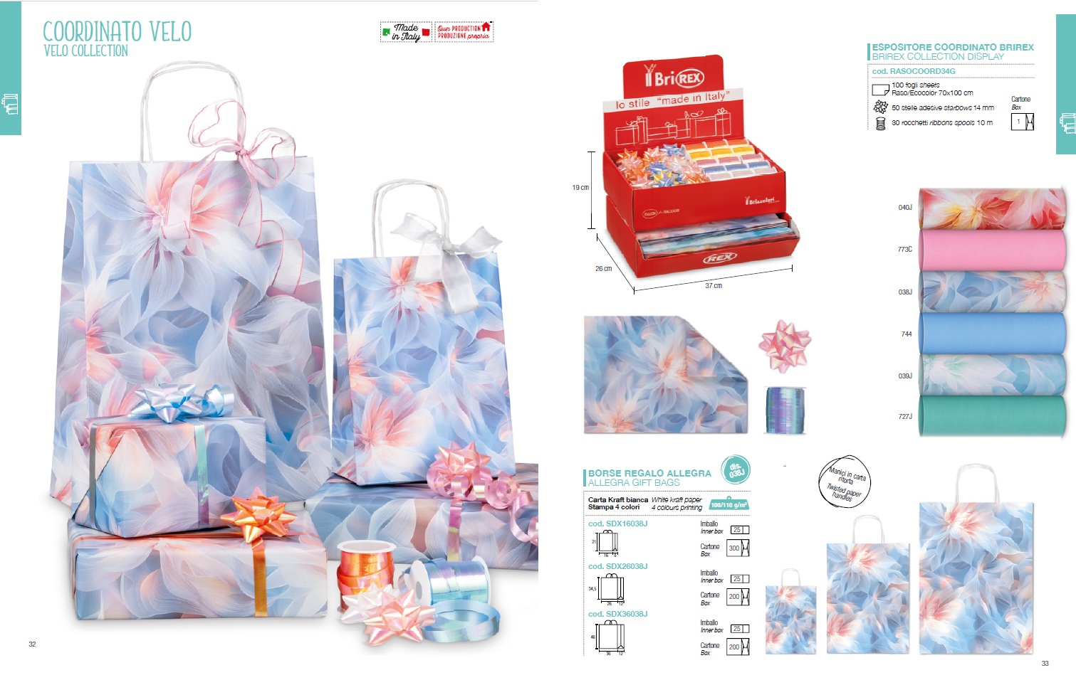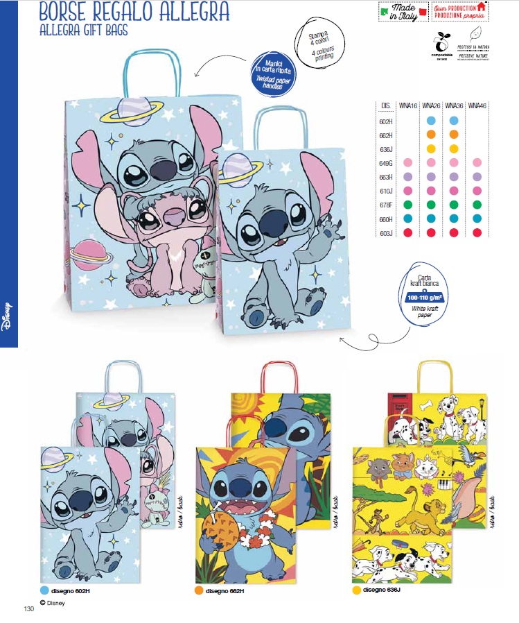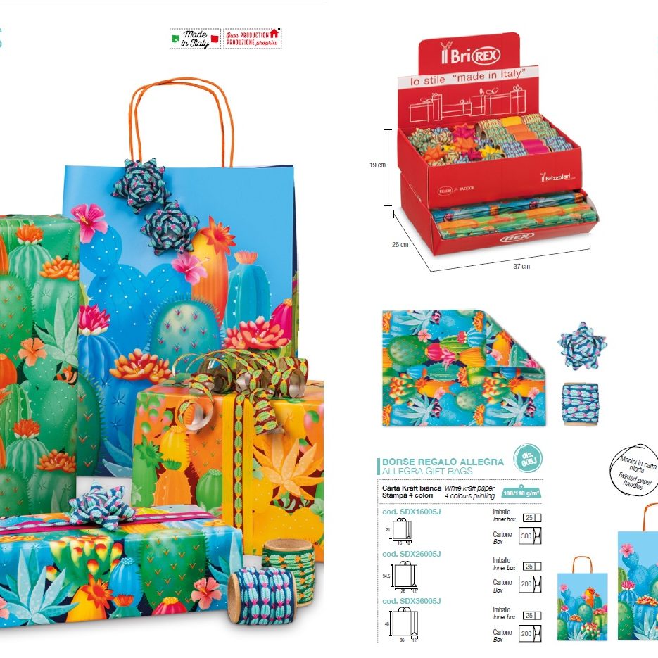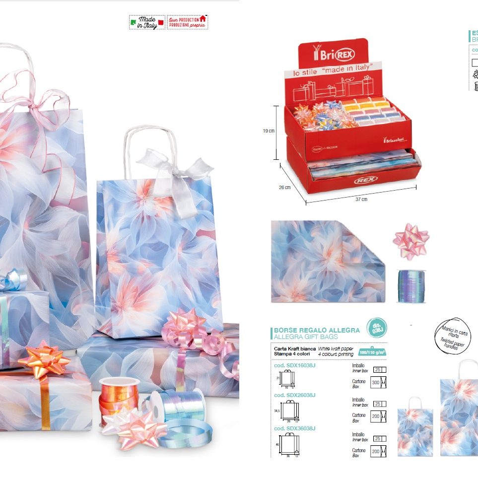 La propuesta se completa con la novedad en bolsas de regalo ALLEGRA MILLEPUNTI, una colección refinada fabricada en papel dúplex de 120 g/m². Disponible en elegantes combinaciones cromáticas —amarillo, rosa y verde con puntos dorados, así como rojo y blanco— sobre papel kraft blanco dúplex con exterior marrón e interior blanco.